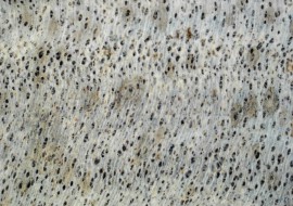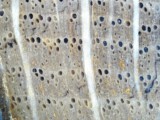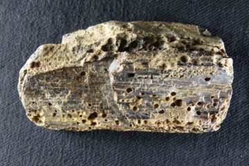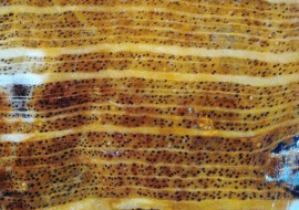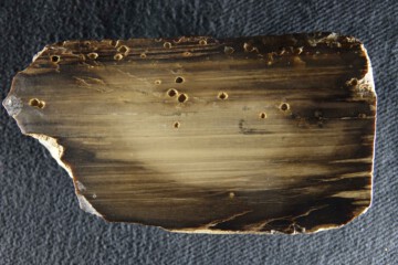 Fossiles Holz mit Bohrgängen vom Klopfkäfer (Anobium) – Längsschnitt